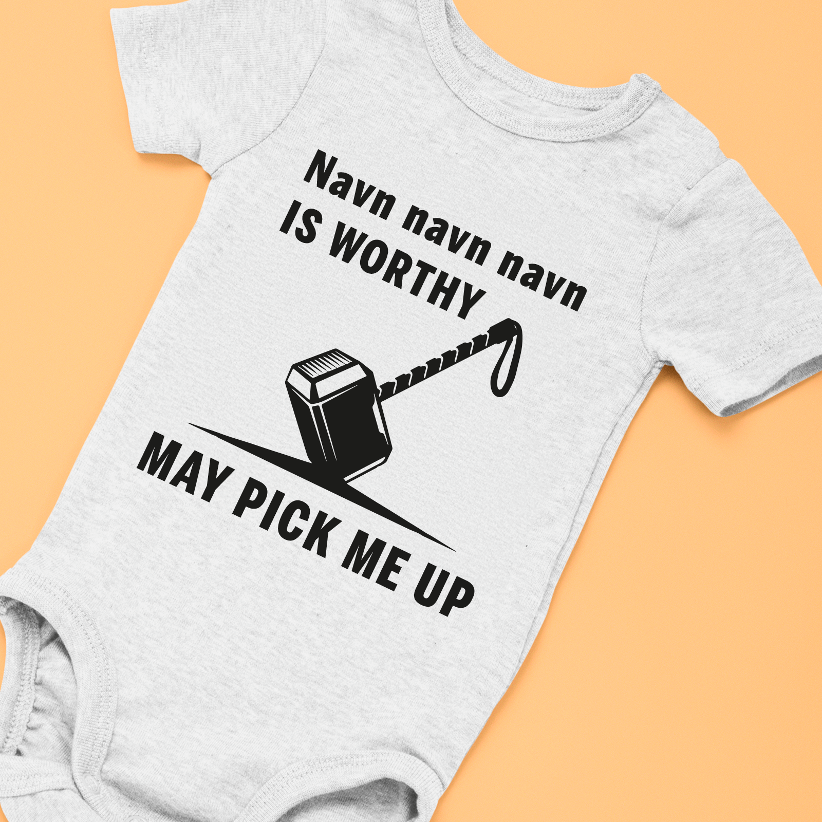 Skab en unik og humoristisk baby bodystocking med teksten “Only the worthy may pick me up – [baby navn]” – du vælger selv babyens navn. Perfekt som en personlig gave til babyshowers, barnedåb eller fødselsdage. Og et billede af Thor’s hammer. Super til små superheltefans ( nok mest far og mor ), der allerede viser styrke og stil. Varm, komfortabel og fyldt med charme til de mindste!